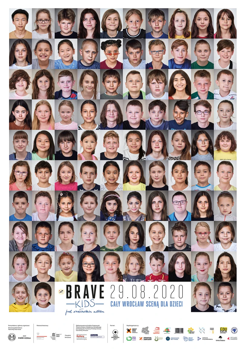 100 twarzy, a każda wyraża dobre emocje – taki jest plakat Brave Kids 2020. Pokazuje dzieci, które uczestniczyły w artystycznych warsztatach w Warszawie, Gdańsku i Wrocławiu w lipcu. Autorem zdjęć jest fotograf Mateusz Bral, od kilku lat dokumentujący nie tylko Brave Kids, ale także Brave Festival. W tym roku fotografował dzieci podczas ich artystycznej pracy, kiedy przygotowywały się do spektakli finałowych w swoich miastach. – Podczas zajęć dzieci oderwały się od swojej codzienności i widać było, jakie towarzyszą im emocje. Nie ukrywały ich, nic nie udawały, po prostu były sobą. Wyzwoliły swoją dobrą energię. Wystarczyło, aby na chwilę skupiły uwagę i powstawał niezwykły portret – mówi Mateusz Bral.