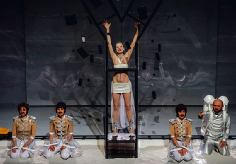 Internet oraz gadżety współczesności z iPhone’ami na czele stanowią natomiast kostium dla całej teatralnej opowieści. Passiniemu udaje się na Scenie Ciśnień dzięki projekcjom i wizualizacjom stworzyć wrażenie labiryntu, przestrzeni wirtualnej, niemożliwej do dotknięcia w tak zwanym realu. Mimo że „Y” nie należy do widowisk szczególnie spektakularnych, od strony scenicznych obrazów w pełni angażuje uwagę. Także dzięki nieoczywistym decyzjom obsadowym, bo trzeba sporej dozy dobrego szaleństwa, by role Lennona, McCartneya, Starra i Harrisona powierzyć czwórce aktorek Capitolu (Helena Sujecka, Pola Błasik, Justyna Antoniak, Agnieszka Oryńska-Lesicka). Dzięki ich głosom i nowym aranżacjom przygotowanym przez Łukasza Wójcika choćby „Strawberry Fields Forever” brzmi, jakbyśmy słyszeli tę piosenkę po raz pierwszy w życiu, choć przecież znamy ją na pamięć. Pierwszy raz za to widzimy Katarzynę Janiszewską debiutującą w Capitolu rolą tytułowej Y. Kreowana przez studentkę wrocławskiej PWST bohaterka przywodzi na myśl tę zagraną przez Alicię Vikander w świetnym filmie „Ex Machina”. Janiszewska znajduje dla swojej Y niepodrabianą naturalność, wdzięk i ciepło. Warto zapamiętać to nazwisko.