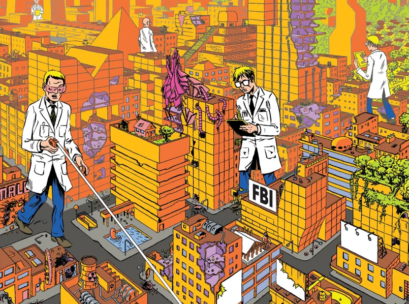 Kaczynskiego fascynuje tkanka miejska, architektura, wpływ metropolii na ludzi jako jednostki i na całe społeczeństwo. Na szczęście artysta unika banalnych spostrzeżeń, że korporacje są złe, a miasto to labirynt, w którym łatwo się zagubić. Prowokuje, zwodzi, zaskakuje nieoczekiwanymi puentami. Ascetyczne prace polsko-amerykańskiego artysty ukazywały się wcześniej przede wszystkim w cyklicznej antologii „Mome”. Zebrane w jednym tomie mają jeszcze większą siłę rażenia. Kaczynski brawurowo łączy science fiction z surrealistycznym humorem, a przenikliwe socjologiczne obserwacje wzbogaca licznymi kulturowymi odniesieniami. Odwołuje się do komiksów Daniela Clowesa, prozy J.G. Ballarda, filozofii Slavoja Žižka i urbanistycznych esejów Jane Jacobs. Podobnych tropów jest więcej, możecie ich poszukać na własną rękę w przygotowanym przez autora indeksie, który sam w sobie jest zabawną lekturą, oprócz nazwisk i miejscowości gromadzi także terminy naukowe, pojęcia filozoficzne, a nawet onomatopeje.