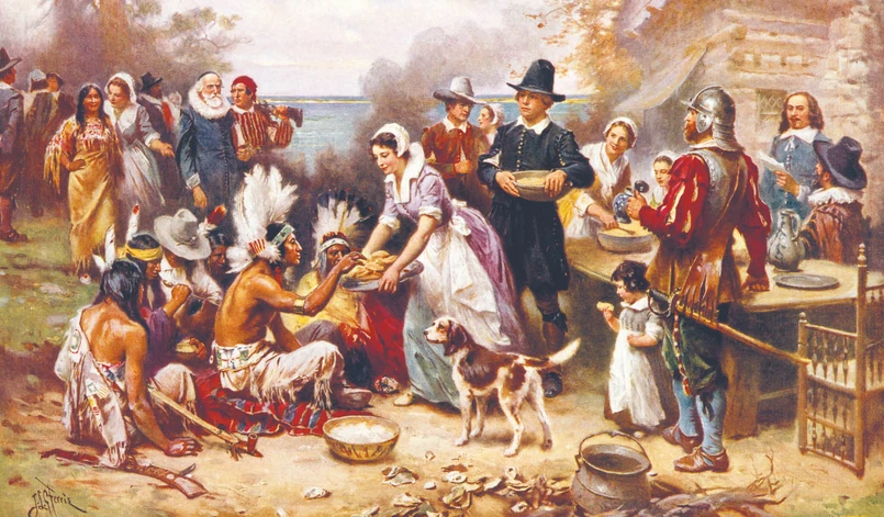 Pierwsze Święto Dziękczynienia w 1621 r. Obraz Jeana Louise'a Gerome'a Ferrisa z ok. 1915 r.